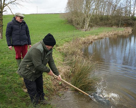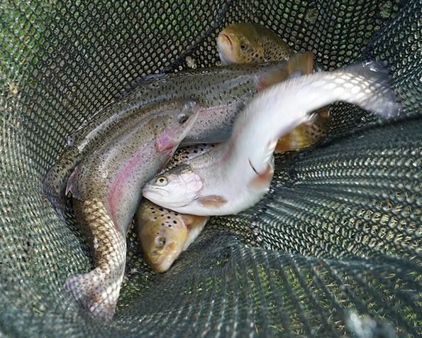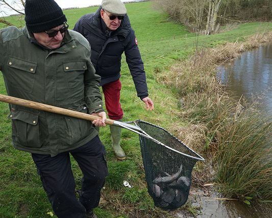 Fishing is only from the bank, a little more than half of which is unobstructed for back casting. (But if you fancy giving your Spey or roll casting an outing, the more overgrown banks can be highly productive, as well as being more sheltered on windy days.) Rainbow trout of up to 2½ lb are caught regularly at Fullingbridge, and brown trout of 4–5 lbs have also been caught. Though most stocking in recent years has been rainbows, we have recently resumed stocking a small percentage of browns.